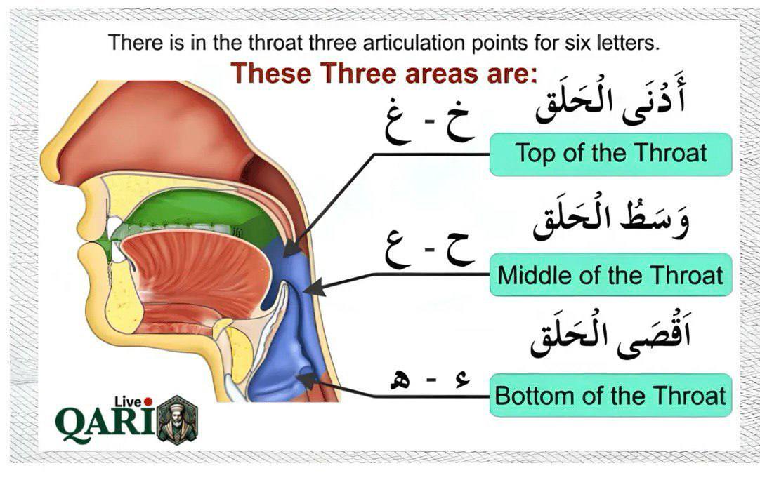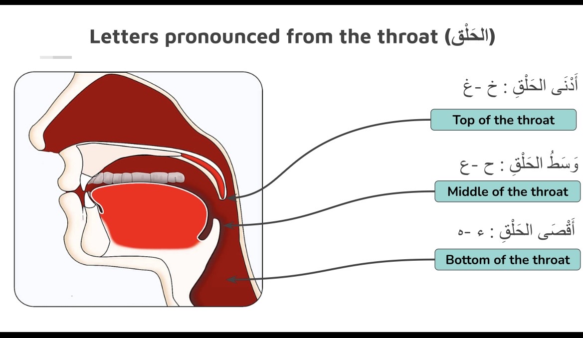 | Quran Level 7 | Introductions Talked about how the year will be organised. Reminders about the intention behind learning the Quran and the importance of sincerity. Read surah Al Fatiha to practice throat three articulation points for 6 letters (see picture) |